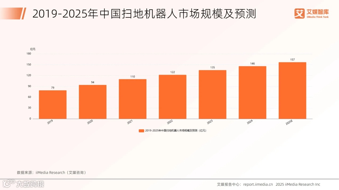 根据全球新经济产业第三方数据挖掘和分析机构iiMedia Research(艾媒咨询)发布的《2025年中国扫地机器人行业发展状况和消费行为调查数据》显示,2024年中国智能小家电市场规模为2099亿元,2030年有望达到3393亿元;2024年中国扫地机器人市场规模为146亿元,2025年有望达到157亿元。