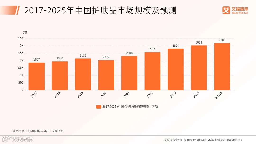 根据全球新经济产业第三方数据挖掘和分析机构iiMedia Research(艾媒咨询)发布的《2025年中国个人面部清洁用品行业发展状况及消费行为调查数据》显示,2024年中国护肤品市场规模为3014亿元,预计2025年将达到3186亿元;2024年中国美容行业市场规模为4318亿元,预计2025年将达到4459亿元。