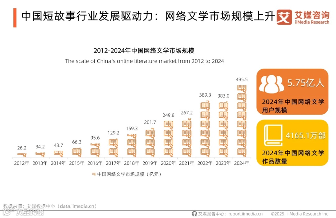 根据全球新经济产业第三方数据挖掘和分析机构iiMedia Research(艾媒咨询)发布的《2025年中国短故事市场发展趋势报告》显示,2024年中国网络文学市场规模达495.5亿元,同比上升29.4%。