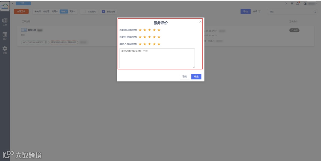 工单完成后,我们新增了服务评价功能,方便用户对本次工单服务进行打分,以更有效地收集客户意见反馈,从而针对性地优化服务流程与体验。