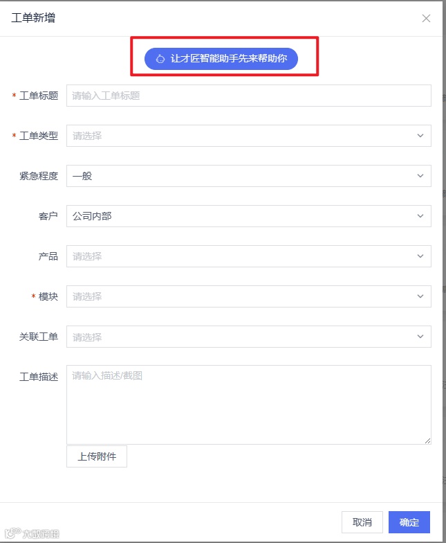 在AI技术爆发式生长的时代,才匠智能紧跟步伐,基于大语言模型,在【发起工单】时增加了【AI智能助手】,帮您更便捷地解决问题!