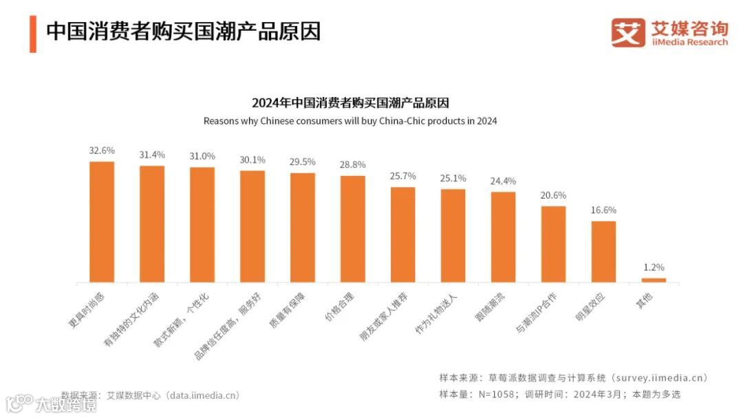 iiMedia Research(艾媒咨询)调研数据显示,消费者购买国潮产品的主要原因是产品更具时尚感及具有独特的文化内涵,占比分别为32.6%和31.4%。国潮产品时尚及个性化的设计能够贴合中国消费者的文化、审美及使用需求,受到众多消费者的青睐。