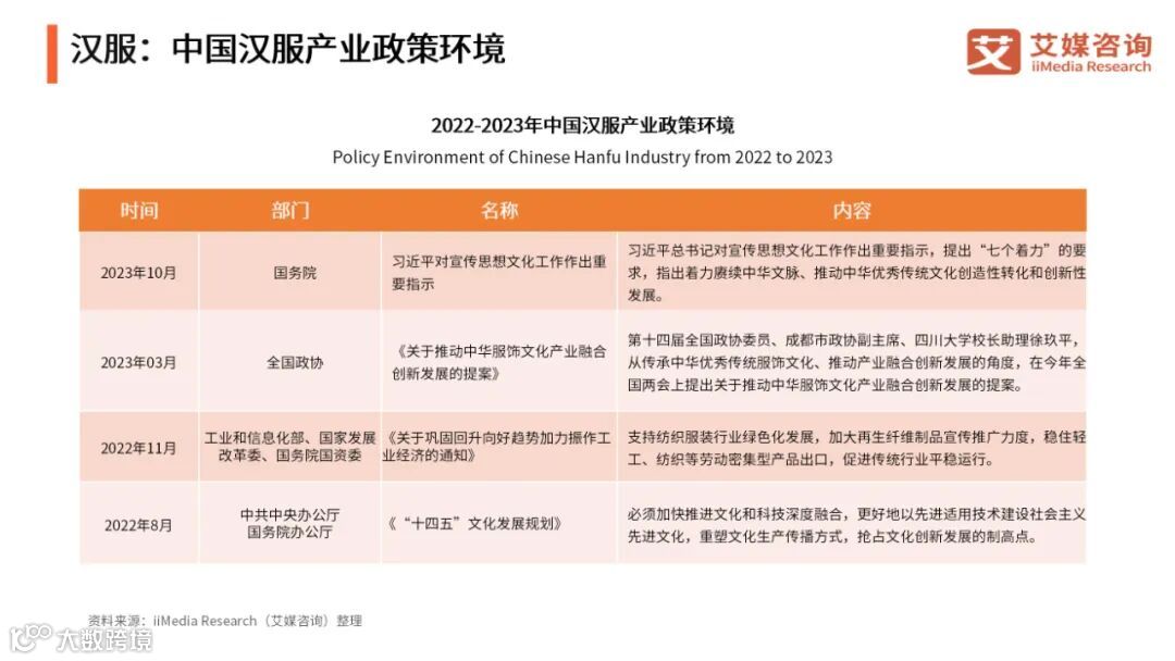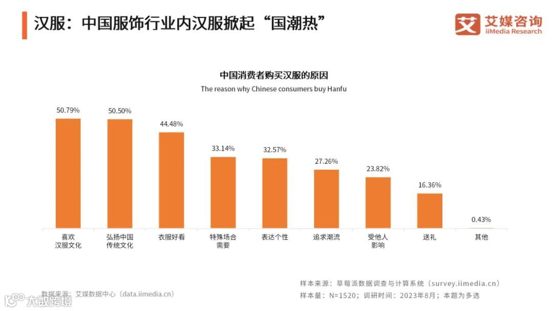 iiMedia Research(艾媒咨询)调研数据显示,50.79%的消费者因为喜欢汉服文化而购买,50.50%的消费者因为弘扬中国传统文化而购买。艾媒咨询分析师认为,年轻一代个性化的需求及文化自信等因素影响下,汉服在中国服饰行业掀起了“国风热潮”。