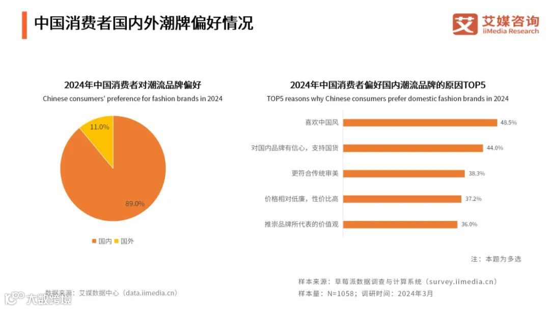 iiMedia Research(艾媒咨询)调研数据显示,近九成的消费者偏好国内的潮流品牌,其主要原因是喜欢中国风与支持国货品牌,占比分别为48.5%和44.0%。艾媒咨询分析师认为,随着中国品牌知名度不断上升以及国潮文化的流行,未来将会有更多消费者优先选择购买国内潮流品牌。