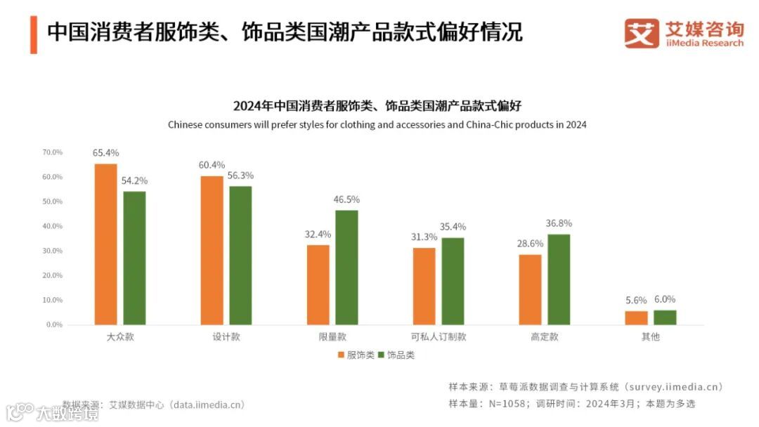 iiMedia Research(艾媒咨询)调研数据显示,消费者购买服饰类、饰品类的国潮产品时,偏好大众款与设计款。近年来,随着中国消费者文化自信的增强与时尚审美的多元化发展,汉服、马面裙等具有设计感的“新中式”国潮服饰在日常穿着场景中越发普及。