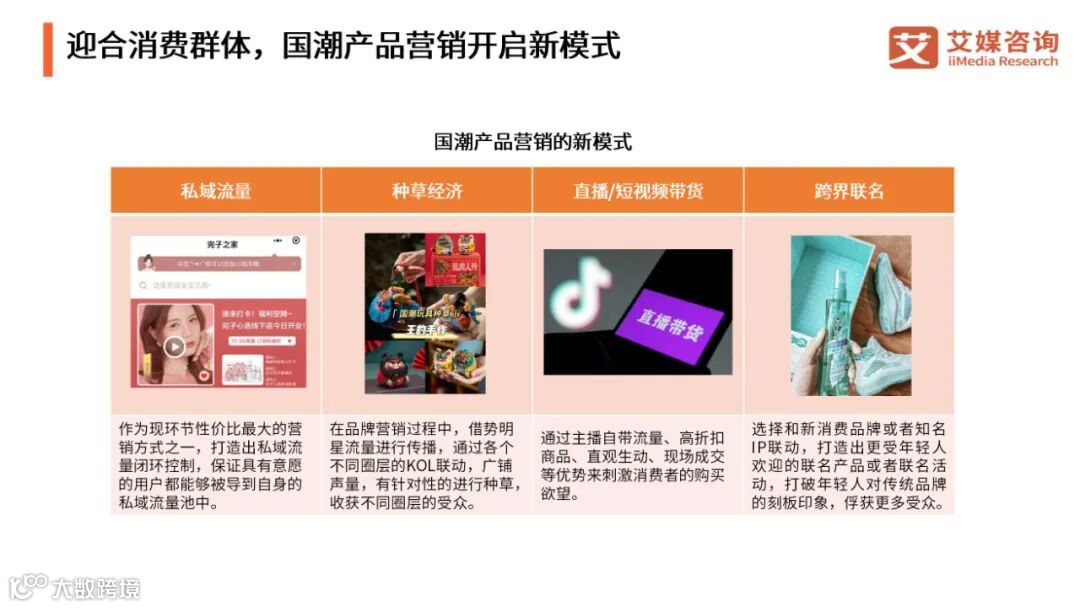 iiMedia Research(艾媒咨询)调研数据显示,消费者了解国潮产品的主要途径是线下展览和时尚活动、综合电商平台和内容分享类平台。艾媒咨询分析师认为,短视频、社交电商等线上软件不仅开拓了消费者的信息接收渠道,更能够助力国潮品牌完成品牌建设,推动国潮由产品到品牌的蜕变。