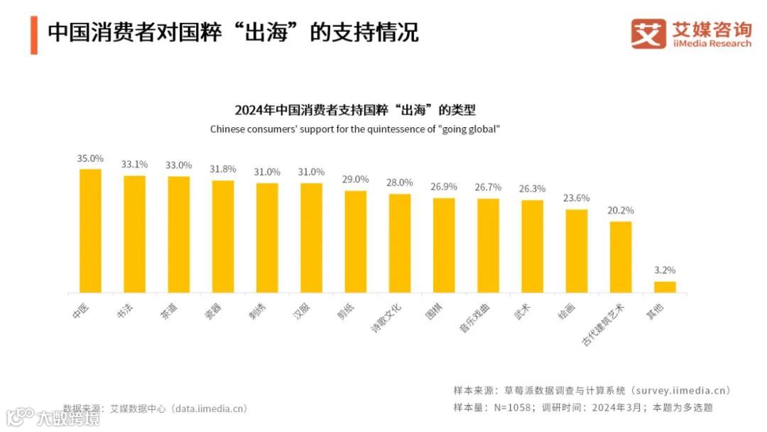 iiMedia Research(艾媒咨询)调研数据显示,消费者对中医、书法、茶道等传统文化“出海”传播较为期待。随着中国经济的快速发展和国际地位的提升,中国消费者对于本土文化的自豪感也在不断增强,文化出海为国货品牌的发展提供了更大的市场空间。