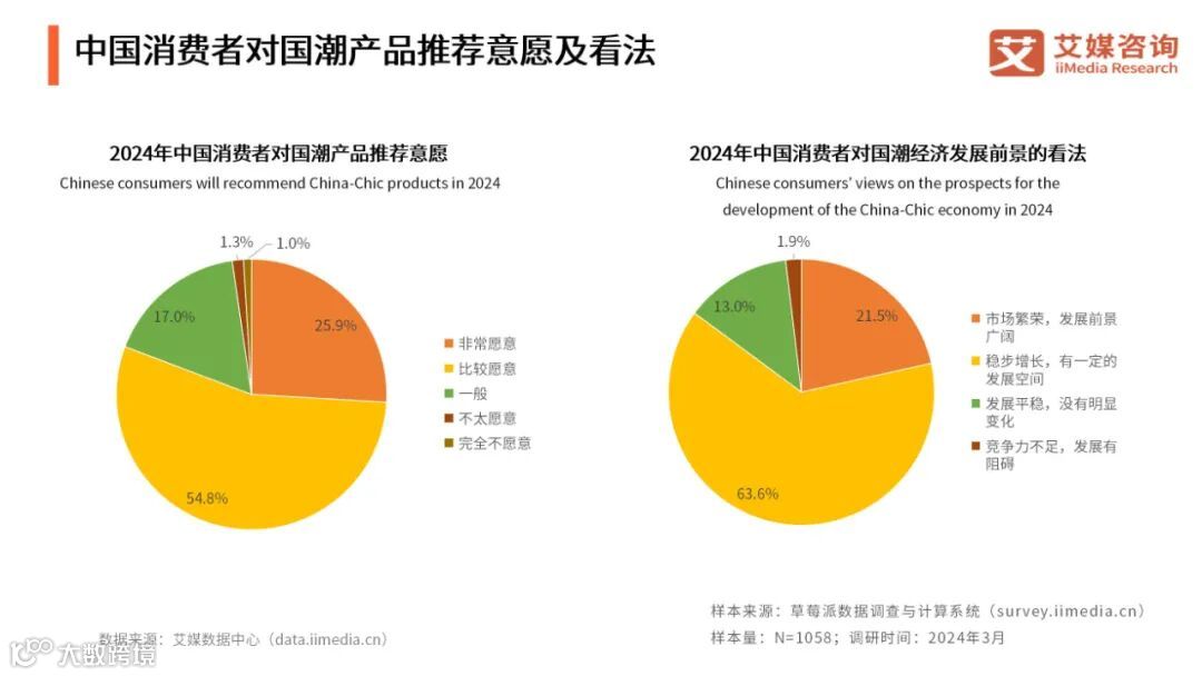 iiMedia Research(艾媒咨询)调研数据显示,消费者对国潮产品的推荐意愿较高,85.1%的消费者对国潮经济的发展前景表示看好。随着国潮品牌的知名度及质量的提升,将会有更多的消费者认可并支持国潮产品。