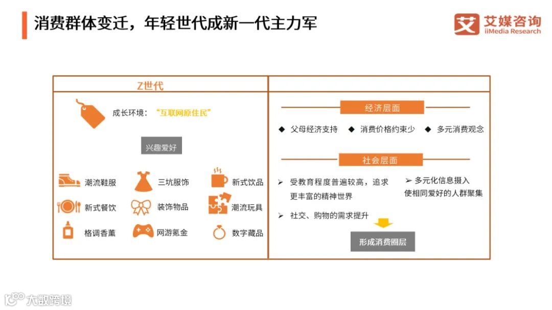 消费的主力群体随着年龄增长在不断的更迭,当前最值得关注的便是“Z世代”、千禧青年等年轻群体。当代年轻人多为独生子女,成长过程中家庭资源独享、物质资源丰富、依赖互联网,这批人的成长时期几乎和互联网/计算机科学的形成与高速发展时期相吻合。他们拥有更富足的家庭、更高的教育水平,最终形成了新一代的消费价值观,细分圈层化加速。