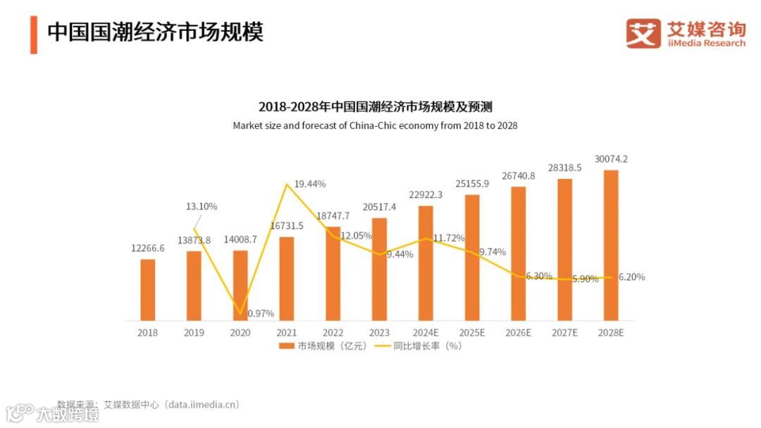 iiMedia Research(艾媒咨询)数据显示,2023年中国国潮经济市场规模为20517.4亿元,同比增长9.44%,预计2028年将突破30000亿元。近年来,国潮品牌在产品创新和品牌营销上持续发力,不断创造出新的消费潮流,行业发展前景广阔。