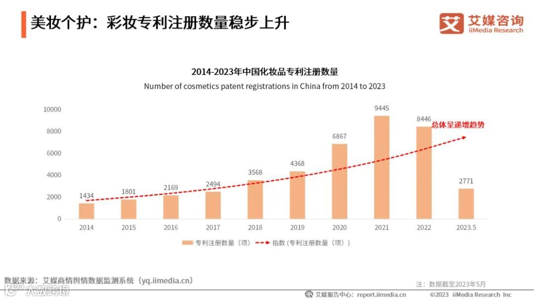 近年来,随着本土品牌的崛起,各美妆品牌也越发注重自主创新,从包装、品类、功效再到生产工艺、原料的创新,本土美妆行业逐步转向高质量发展。数据显示,2014年-2021年化妆品专利数量呈逐年增长趋势,2022年专利注册数量为8446项,虽较2021年稍有下滑,但总体上本土美妆行业创新势头不减,创新趋势明显。