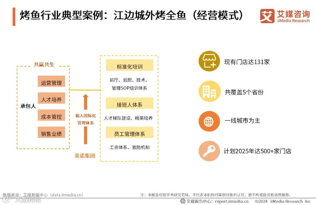 2018年,美诺完成对江边城外烤全鱼的收购,加快了扩张步伐。江边城外烤全鱼近年来高速发展,通过“共生共赢”的承包人模式,将员工与公司利益绑定,并植入美诺集团的国际化管理体系,建立员工培训体系、接班人体系、员工管理体系三大“自培养”人才体系,持续为企业输送人才。截至2024年1月,江边城外烤全鱼现有门店达131家,覆盖5个省份、8个城市,一线城市占比69.5%。