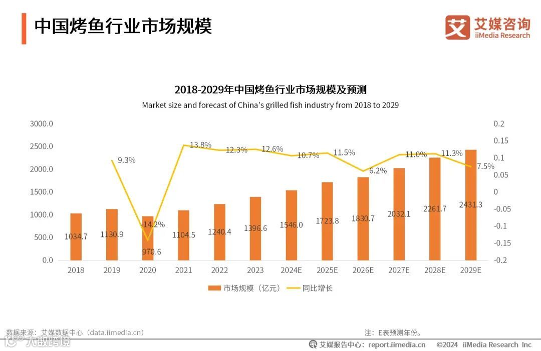 市场规模:烤鱼行业步入稳定增长期,2029年中国烤鱼行业市场规模有望达2431.3亿元