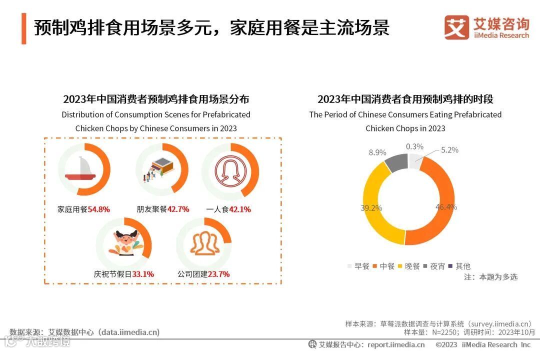 iiMedia Research(艾媒咨询)调研数据显示,预制鸡排消费场景多样,适用于多人聚餐、一人食等场景。其中,家庭用餐占比54.8%,朋友聚餐占比42.7%,一人食占比42.1%。消费时段多集中在中餐和晚餐,占比分别为46.4%、39.2%。预制鸡排消费场景多样,即可当主食,也可当做解馋零食。商家可基于不同需求,引领消费场景,推出更多品类。