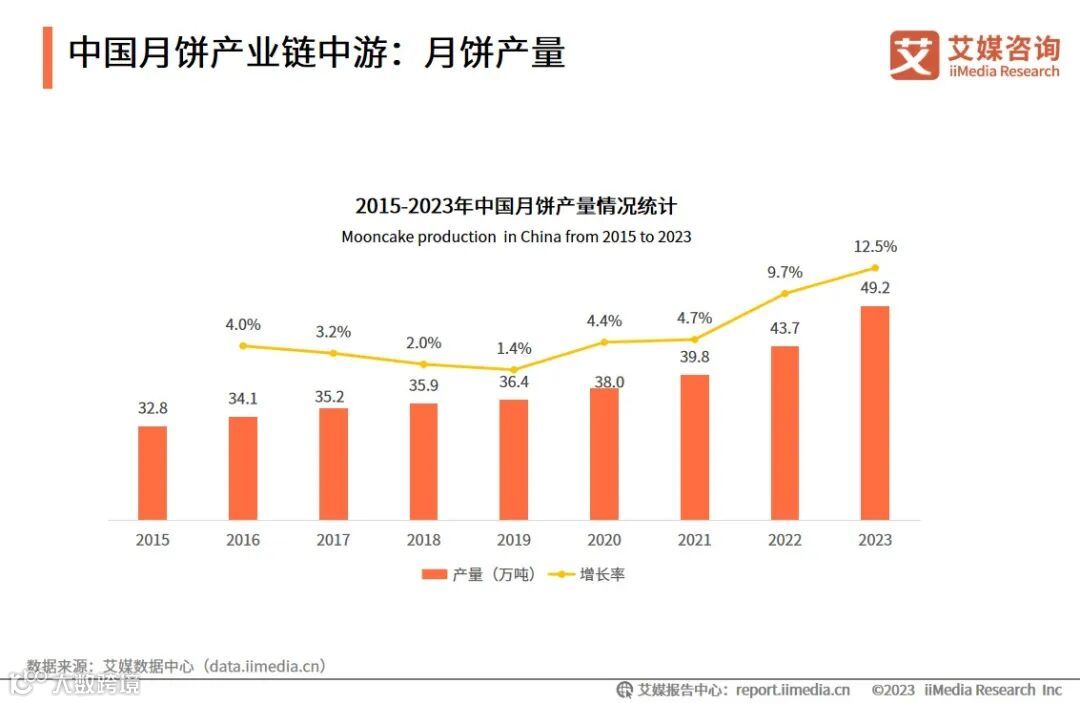消费升级以及人们对传统节日的重视推动了月饼产量的增长。iiMedia Research(艾媒咨询)数据显示,近年来中国月饼产量逐年增加,2022年中国月饼产量达43.7万吨,2023年达49.2万吨。艾媒咨询分析师认为,中国月饼行业的生产趋于标准化、规范化;传统节日氛围的强化;以及国民购买力的增强都是市场需求扩大的因素。