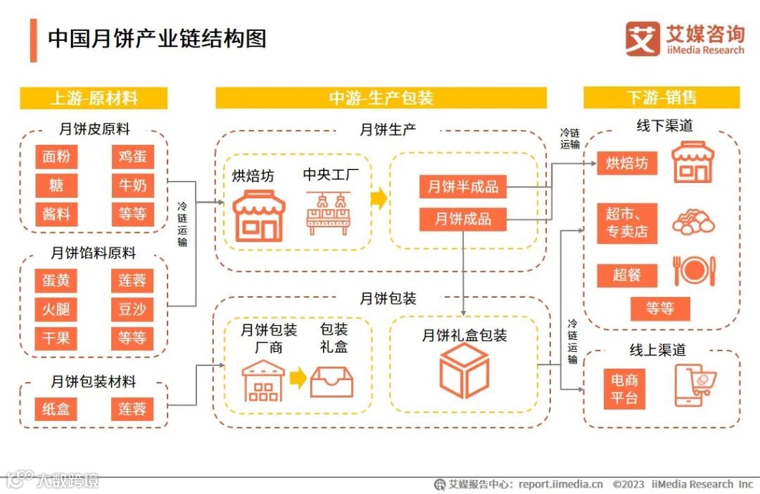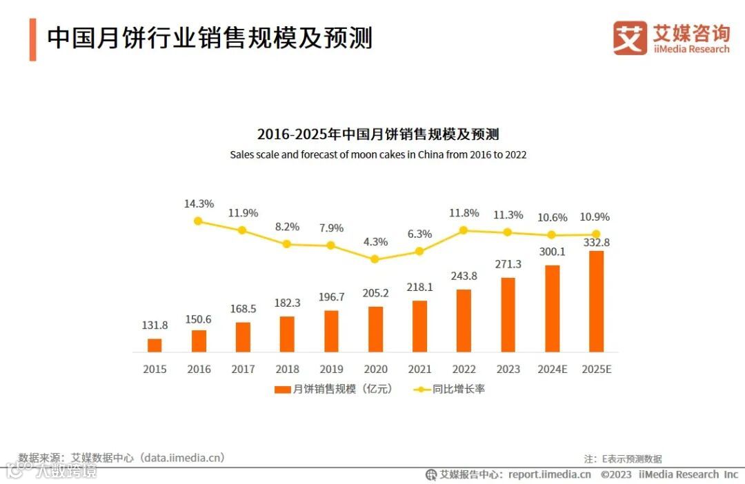 iiMedia Research(艾媒咨询)数据显示,2023年中国月饼销售规模达271.3亿元,同比增长11.3%,2025年有望增至332.8亿元。2023年月饼市场高端品牌化、下沉平民化类产品热销,中间价位整体平淡的新状况;直播电商、外贸出口、品牌定制等新趋势明显,传统商超大卖场销售不及预期。