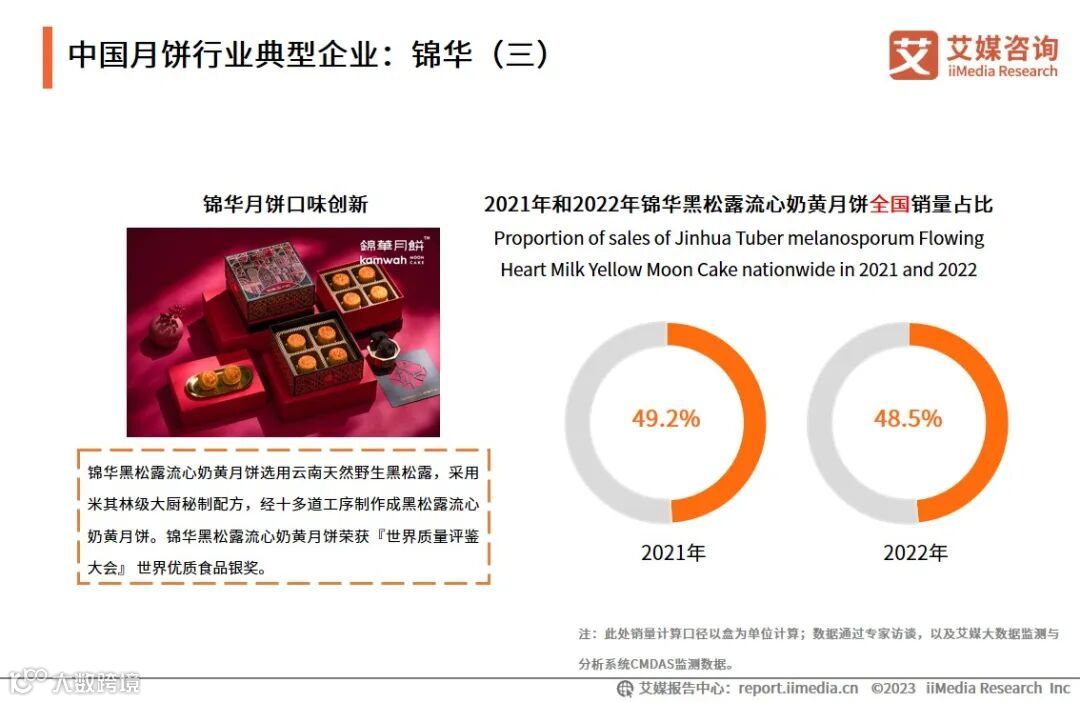近两年,黑松露流心奶黄月饼走俏市场,赢得了广大消费者的喜爱。2019年,锦华月饼全国首创黑松露流心奶黄月饼上市,销量增长势头迅猛,引发了市场的看好和跟随。从市场表现来看,锦华黑松露流心奶黄月饼连续两年销量市场份额全国排在第一,2021年和2022年其销量市场份额分别为49.2%、48.5%。