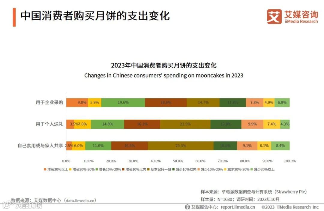 iiMedia Research(艾媒咨询)数据显示,相较2022年,超半数的中国月饼消费者在各个用途下的购买支出基本保持一致或有所增长;其中,企业采购用途的消费支出增长幅度最大,38.2%的企业端消费者增长幅度在20%以内。近年来,员工和企业对于中秋福利的重视度均在增强,企业更加注重个性化定制礼盒的创新性和实用性。