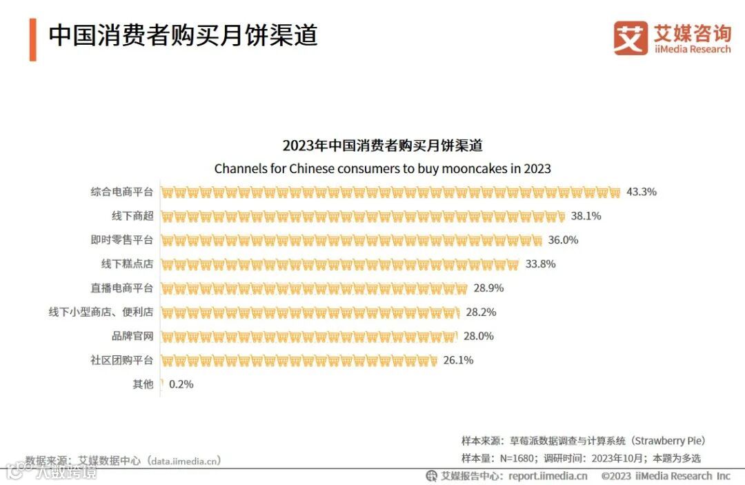 iiMedia Research(艾媒咨询)数据显示,中国月饼消费者主要通过综合电商平台(43.3%)、线下商超(38.1%)和即时零售平台(36.0%)购买月饼。消费者购买月饼渠道多样,如直播电商一类的销售渠道互动性更强、转化率更高,在新营销手法下,能够为企业带来线上新增长点。