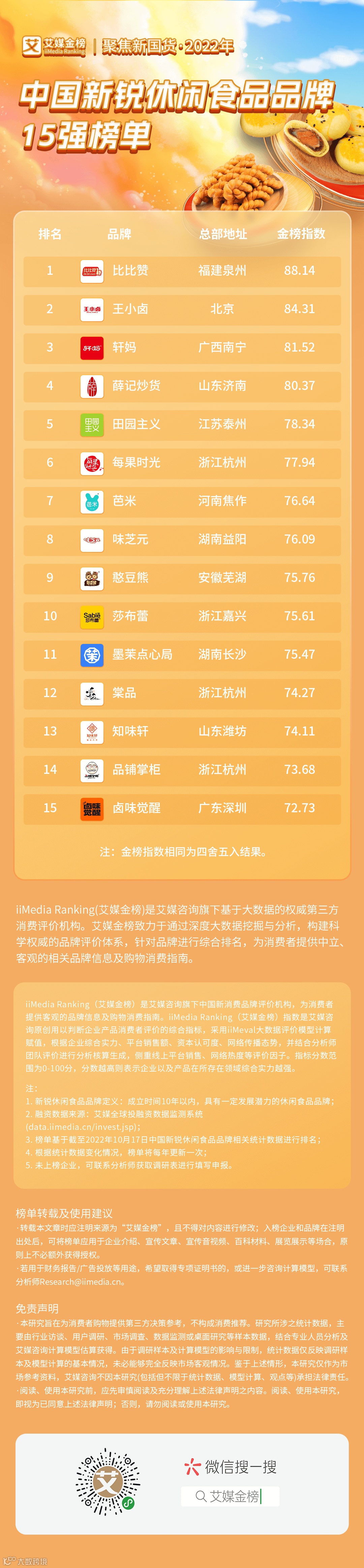 本次上榜《艾媒咨询|2022年中国新锐休闲食品品牌15强榜单》的品牌分别是: