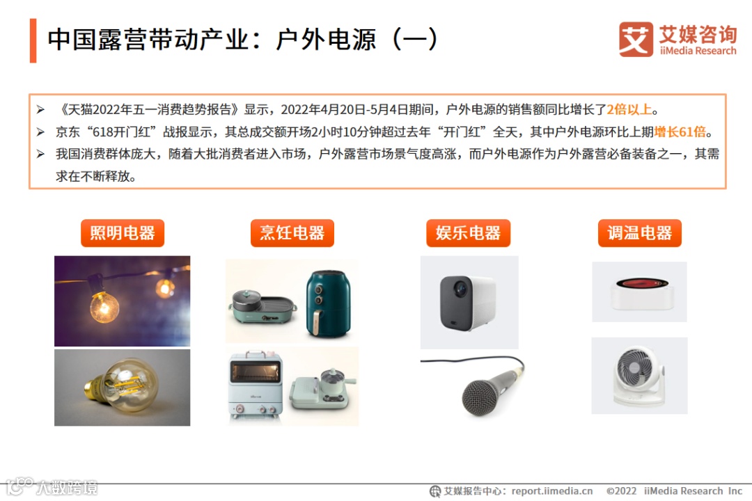 随着露营经济的爆火,与露营相关的家居家电的销售量也暴涨,如露营所需要的天幕、帐篷、户外桌子、椅子、户外营地车、帆板、烧烤盘、风扇、小电锅、烧水壶、煮蛋器、便携式智能投影仪等家居家电产品,都受到了消费者的喜爱,热销一时。