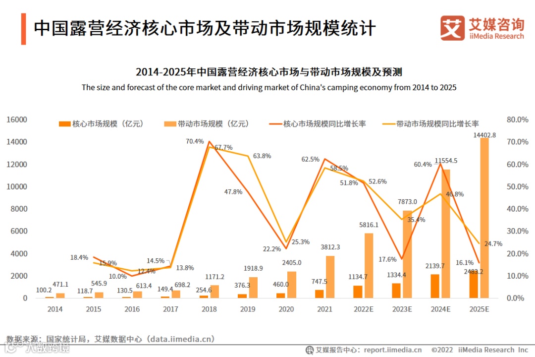 iiMedia Research(艾媒咨询)数据显示,中国露营经济核心市场规模和带动市场规模均呈现逐年上升的趋势。2021年中国露营经济核心市场规模达到747.5亿元,同比增长62.5%;带动市场规模为3812.3亿元。预计2025年中国露营经济核心市场规模将上升至2483.2亿元,带动市场规模将达到14402.8亿元。