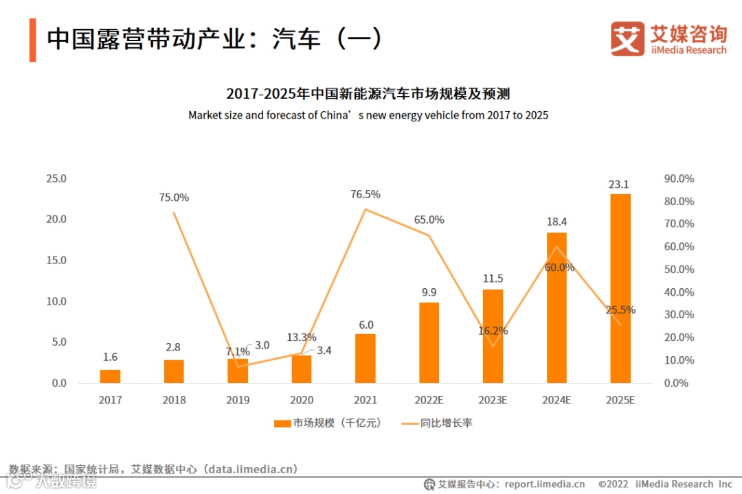 数据显示,2021年中国新能源汽车市场规模为6000亿元,同比增长76.5%,预计在未来的四年,中国新能源汽车的市场规模保持逐年上升的趋势。艾媒咨询分析师认为,一些新能源品牌利用新能源汽车燃料价格较低的优势,陆续推出露营、旅行等模式,让其能耗降至最低,为消费者外出露营降低了出行和使用成本。