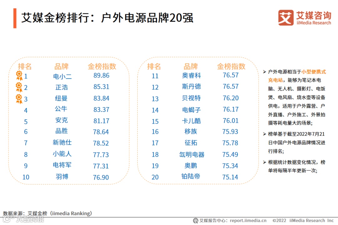 iiMedia Ranking艾媒金榜最新发布了《2022年中国户外电源品牌排行榜TOP20》,本次上榜的品牌分别是电小二、正浩、纽曼、公牛、安克、品胜、新驰仕、小能人、电将军、羽博、奥睿科、斯丹德、贝视特、电蝎子、卡儿酷、移族、征拓、氙明电器、奥鹏、铂陆帝。其中,华宝新能旗下的核心品牌电小二以89.86的金榜指数夺得桂冠,正浩(85.31)、纽曼(83.84)分别位列第二、第三名。