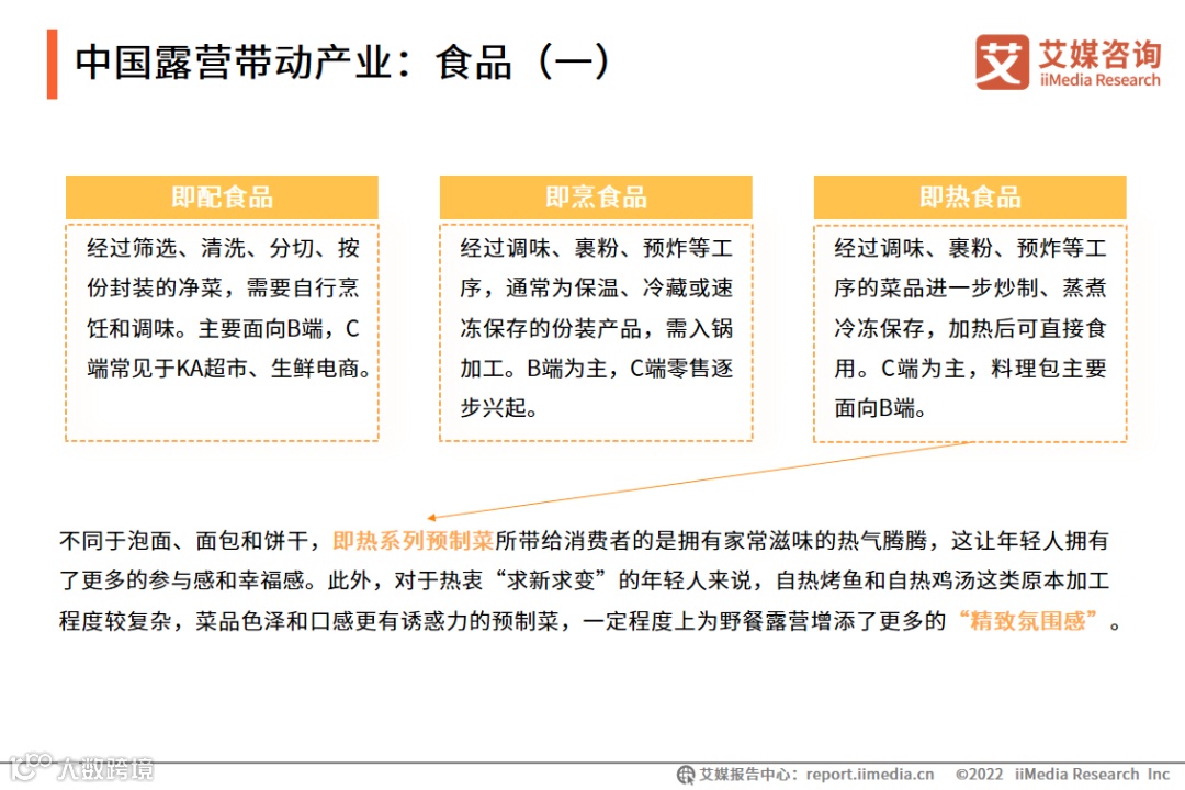 特殊时期让短途旅行成为消费者出游的一大选择,“郊游露营”也成为年轻人出游休闲必打卡项目之一。露营的火爆,不仅带动了与之相关的交通工具、家居家电,预制菜也因露营而“火”上加“火”,热度更甚,成功上榜露营必备清单,“露营+野餐”的组合也进一步扩展了预制菜的使用场景。