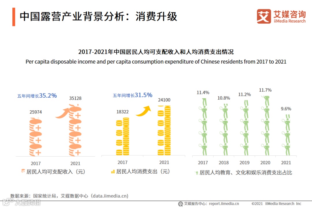 2021年,中国居民人均可支配收入为35128元,人均消费支出为24100元,相比2017年均增长超过三成。在人均教育、文化和娱乐消费支出占比方面,2021年受疫情影响有所降低,但从整体来看,2017至2021年的五年间均维持在10%左右。艾媒咨询分析师认为,随着中国消费者可支配收入的提高,其消费结构也会更多地从基本吃穿消费,向发展型和享受型消费倾斜。消费升级趋势愈发明显,消费者越来越追求更高品质的生活方式,成为拉动露营产业经济增长的重要因素。