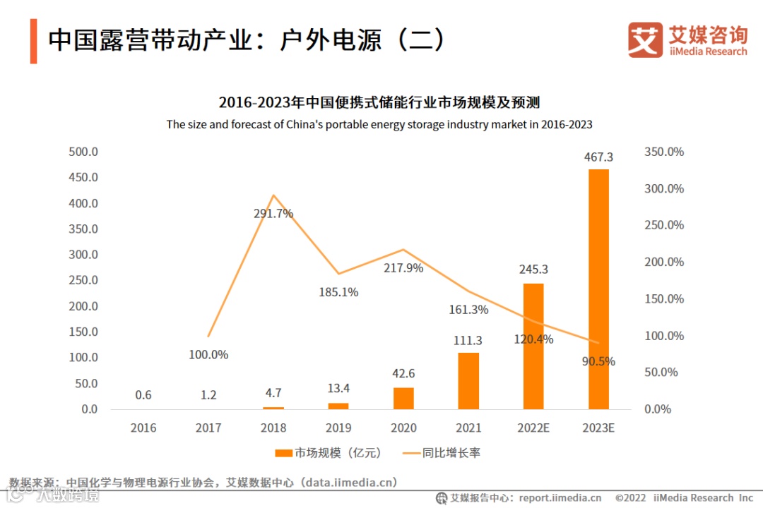 数据显示,全球便携式储能行业市场规模已由2016年的0.6亿元增长至2021年的111.3亿元,年均复合增长率达194.2%。预计到2023年,全球便携式储能行业市场规模将达到467.3亿元。近些年来,受露营经济爆火的带动,寻求自由、亲近自然的户外生活亦成为趋势,户外用电需求日益增加;同时受益于受新能源汽车的发展,上游锂离子电池产业走向成熟。在这种背景下,便携式储能行业也得以高速发展。