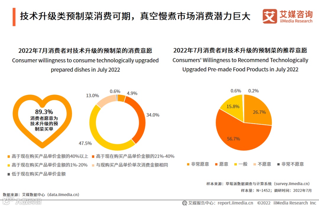 2022年7月调研数据显示,消费者对技术升级的预制菜消费意愿强烈(89.3%),且愿意花费金额高于目前产品价格1%-40%(81.5%);消费者对这类技术升级的预制菜推荐意向较高(83.4%),愿意推荐给身边的人。艾媒咨询分析师认为,当下预制菜以传统加工技术为主,产品还原度仍较欠缺,消费者对技术升级的预制菜产品抱有较高期望,若厂商积极对产品进行升级,消费者购买的热情会更加高涨。