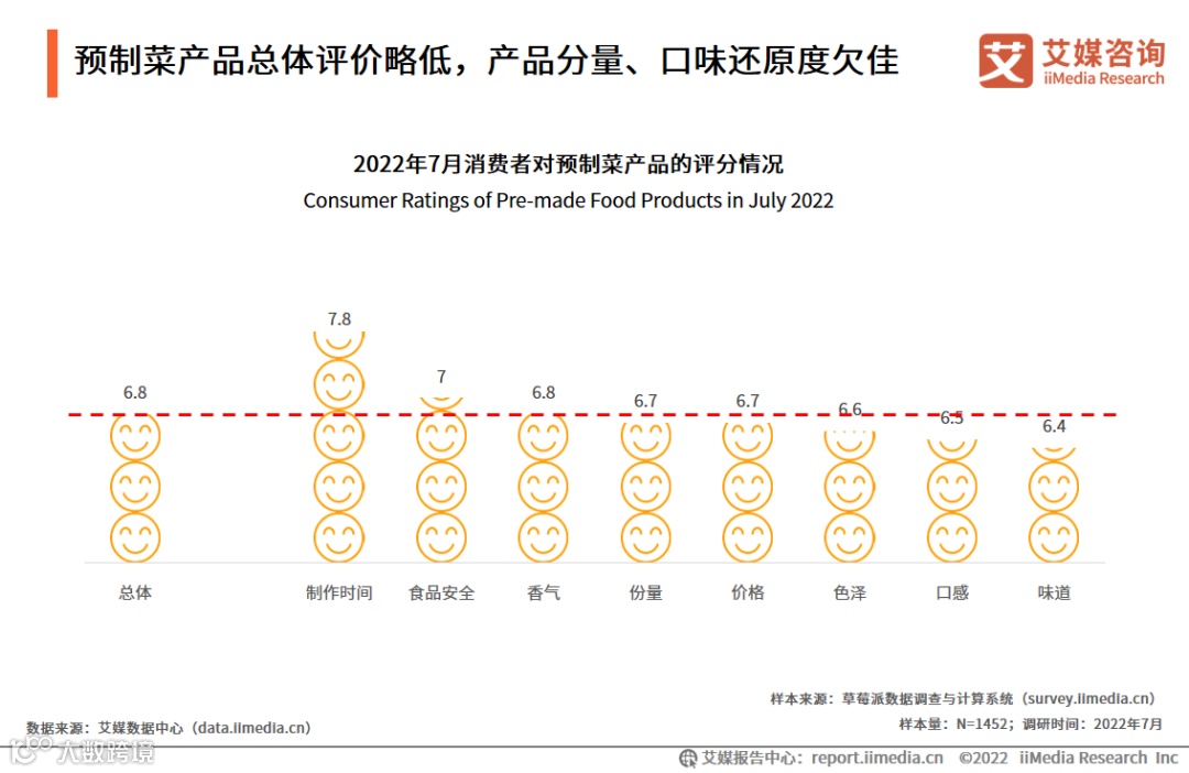 2022年7月调研数据显示,消费者对预制菜总体评分略低(6.8分),其中制作时间(7.8分)评分较高,产品的份量(6.7分)、价格(6.7分)、色泽(6.6分)、口感(6.5分)、味道(6.4分)低于总体得分。艾媒咨询分析师认为,消费者也认同预制菜具有减少制作菜肴的时间的特性,但对于口味还原度及分量评价较低。