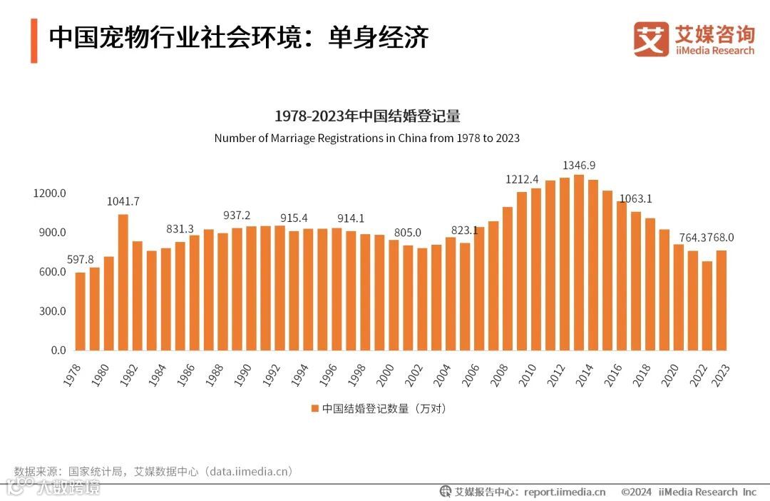 数据显示,自2013年后,中国结婚登记人数开始逐年下降。2023年全国结婚登记数为768.0万对,为十年来首次回升。艾媒咨询分析师认为,快节奏的工作和生活间接影响着都市男女的单身比例。单身群体往往更倾向于将情感寄托于宠物,视宠物为家庭的重要成员,单身经济推动了宠物市场的快速发展和消费升级。