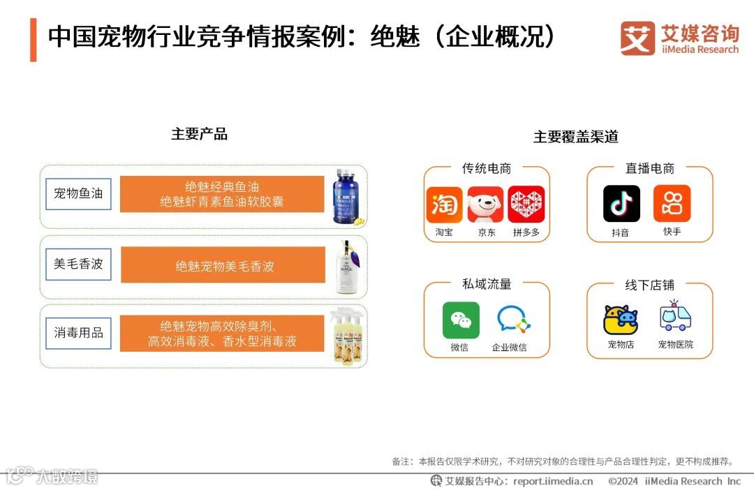 武汉绝魅宠业生物科技有限公司创立于2014年。调查显示,2016年绝魅鱼油胶囊产品上市,是中国宠物鱼油胶囊产品开创者。该企业主要致力于宠物用品、营养保健品、消毒用品、饲料、环保产品等开发、销售和货物进出口,是一家集科研、开发、生产、销售于一体的新兴企业。绝魅宠业现拥有传统电商、直播电商、私域流量、线下店铺四大板块销售渠道,其中线下店铺遍布全国二十多个省市地区。