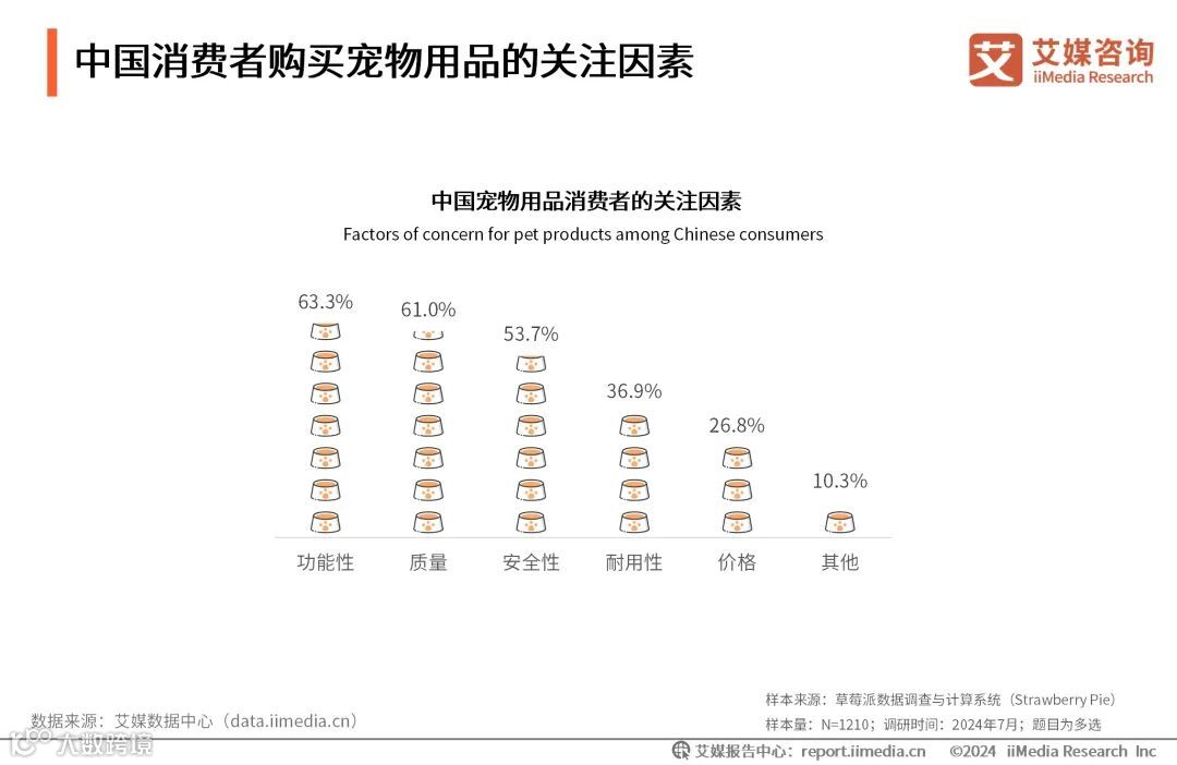 iiMedia Research(艾媒咨询)数据显示,购买宠物用品时,六成以上的消费者会关注功能性和质量,其次会关注安全性和耐用性。艾媒咨询分析师认为,消费者越来越重视宠物的生活品质和宠物用品的实用价值,开发出功能多样、质量卓越的宠物用品是企业树立良好口碑的关键。