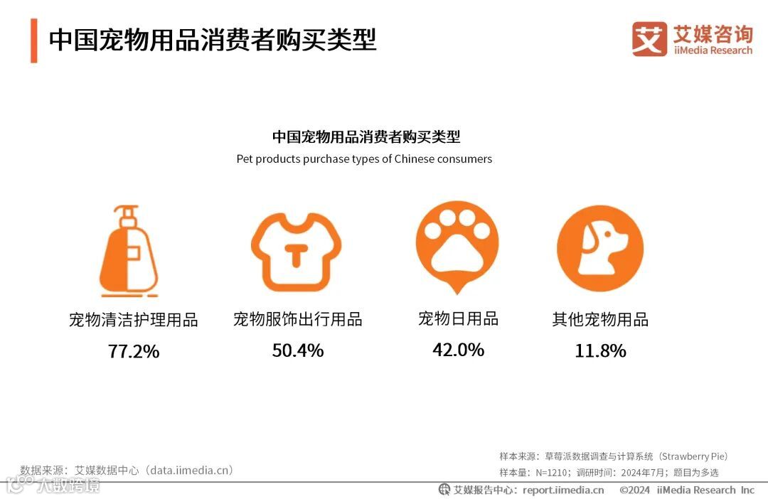 iiMedia Research(艾媒咨询)数据显示,中国消费者经常购买的宠物用品类型主要为宠物清洁护理用品,占77.2%,购买宠物服饰出行用品的占50.4%。艾媒咨询分析师认为,中国宠物用品市场正朝着更加专业化、细分化和品质化的方向发展,宠物清洁护理用品的热销是这一趋势的显著标志。宠物服饰出行用品的热销则进一步拓宽了宠物用品市场的边界。