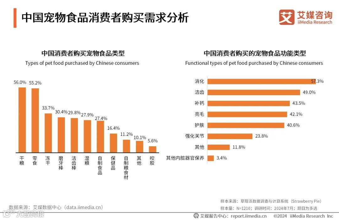 消费洞察:宠物食品消费以干粮、零食为主;消化用途的功能性食品购买率最高
