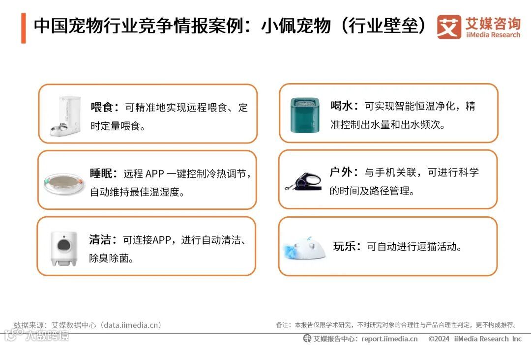 数据显示,2024年“618”期间,天猫平台宠物智能除味器销售额同比增长超330%,宠物智能喂食器销售额同比增长超230%,智能猫砂盆销售额同比增长超140%,宠物智能烘干箱销售额同比增长超120%。艾媒咨询分析师认为,数字化、智能化升级已成为中国宠物用品行业的发展趋势,小米、美的、海尔等科技领域巨头跨界入局宠物用品行业,给智能用品品类带来新的增长点。