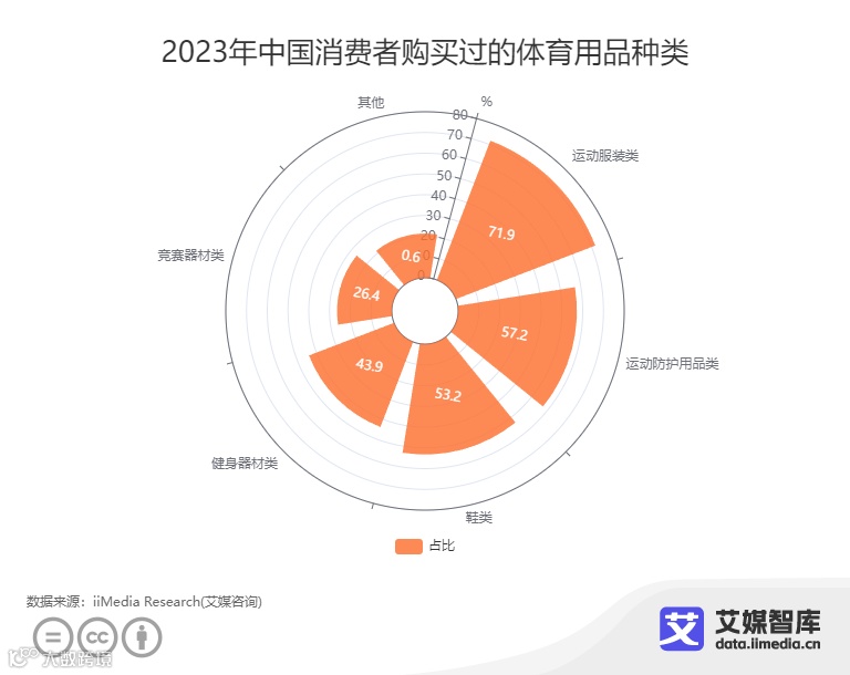 中国消费者购买过的体育用品种类多样,涵盖多个方面。iiMedia Research(艾媒咨询)数据显示,在2023年中国消费者购买过的体育用品种类中,71.9%的消费者表示购买过运动服装类,57.2%的消费者表示购买过运动防护用品类,53.2%的消费者表示购买过鞋类。体育产业发展带动体育消费,体育用品行业也将得到相应发展。