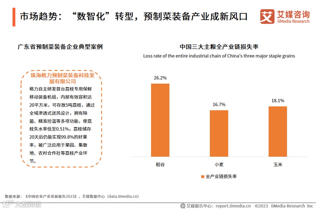 数据显示,全球每年食品供应链上的食物损失约占全球食物供给量的1/3,其中每年约有14%的食物在收储运和加工包装环节被损失。我国三大主粮在全产业链均有不同程度的损失率,其中稻谷的损失率达到26.2%。预制菜装备能够有效促进农产品全产业链减损,许多家电企业争相入局预制菜装备赛道,预制菜装备市场规模有望在5年内从百亿元升至千亿元。