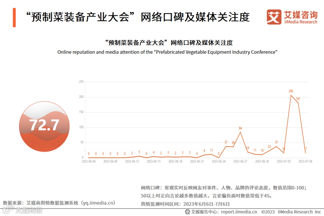 艾媒商舆情数据监测系统显示,早在6月12日,相关媒体就开始为预制菜装备产业大会预热;在6月24-28日期间形成了媒体关注度小高峰。预制菜装备产业大会的媒体关注度在开幕第二天达到最高峰,且会议结束后一天内仍有较多相关报道发布。预制菜装备产业大会网络口碑指数为72.7,反映出网民对本次活动整体评价较高。