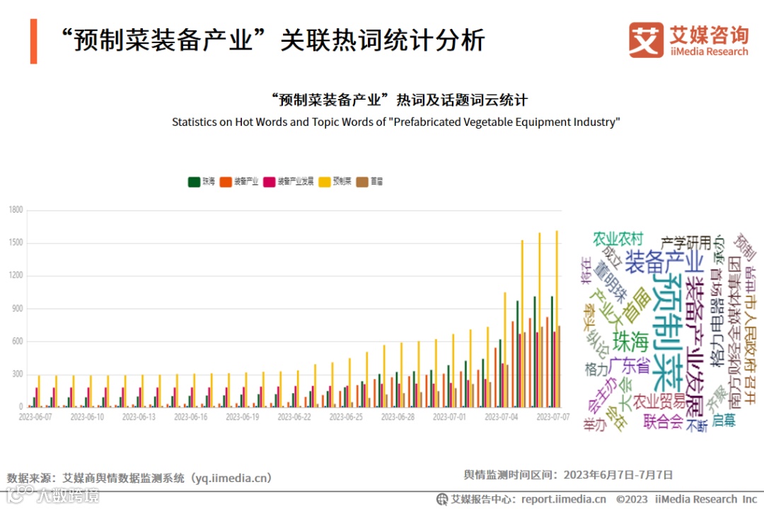 艾媒商舆情数据监测系统显示,“预制菜”“珠海”“装备产业发展”等成为预制菜装备产业大会相关话题的高频词云。预制菜装备产业链涉及加工、生产、保鲜、冷链多个环节,随着预制菜行业数智化升级发展不断提速,预制菜行业装备升级刻不容缓。