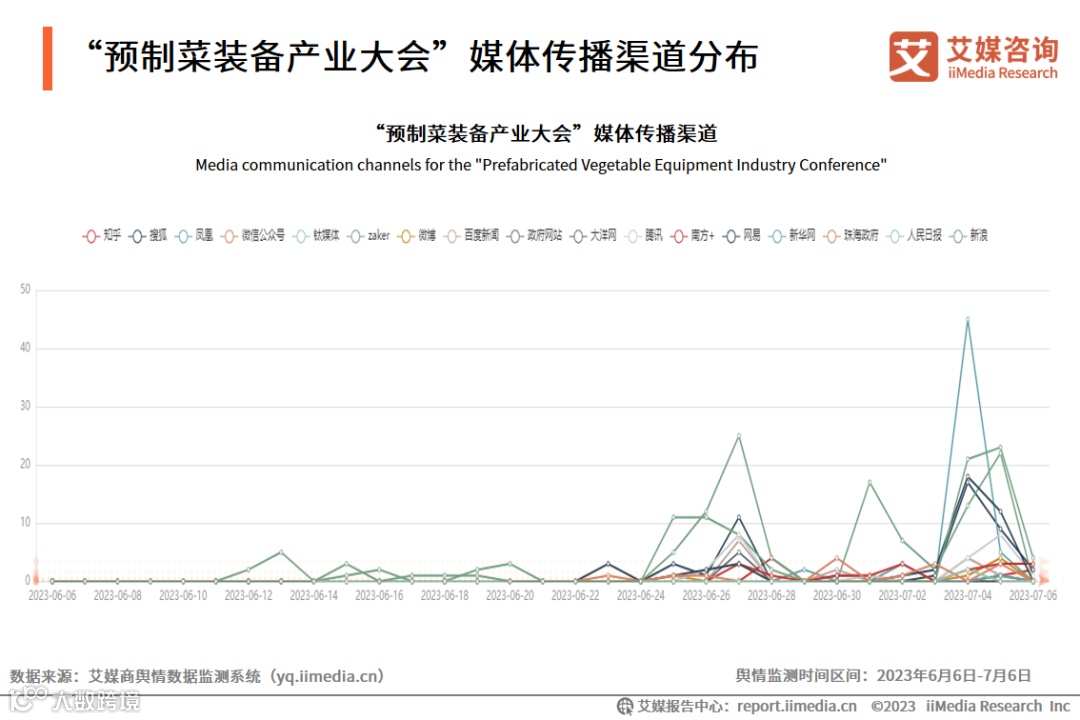 预制菜装备产业大会在门户网站、新闻客户端等传统载体具有较高热度。艾媒商舆情数据监测系统显示,早在6月12日,zaker最开始为预制菜装备产业大会预热。6.24-6.28期间,各媒体接力发布报道形成传播小高峰,其中新浪在6月27日发布了25条相关报道。会前,媒体持续为预制菜装备产业大会预热,7月1日zaker发布了17条相关报道。大会第二天,媒体传播量达到峰值,其中凤凰网在当天发布了45条报道。