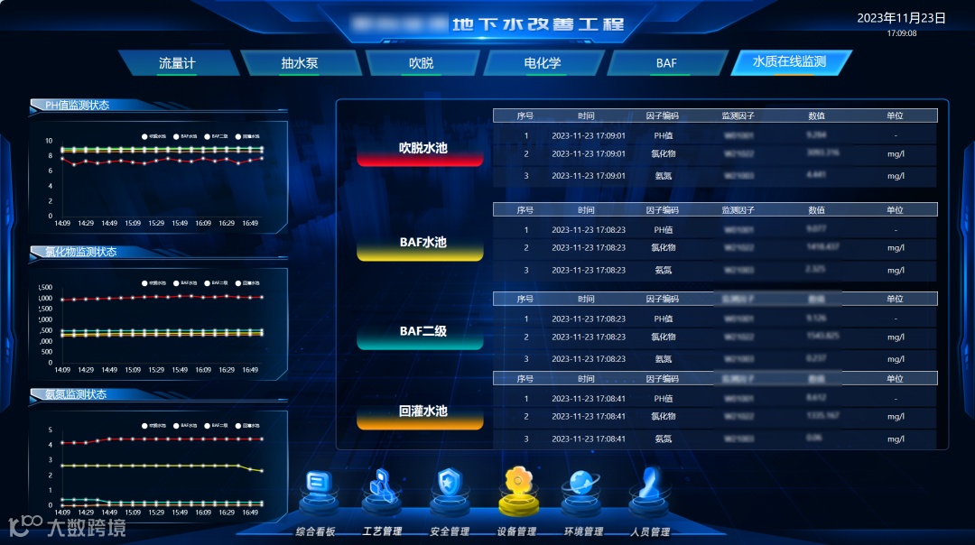 相比之下,环境治理智慧平台是一种更加高效和可持续的水处理方式。在本次处理项目中,才匠智能团队对厂区1000多口井和吹脱、电化学等20多台水处理修复设备都进行了物联网数字化改造。该平台可以通过智能化监测和数据分析,实现水处理设备的自动化操作,大大减少了人工干预。包括抽水泵是否在运行、运行工作时长统计、污水处理流量计等现场的实际情况和数据,工作人员只需要坐在办公室通过智慧平台上的数字看板就能实时获取精准的数据。