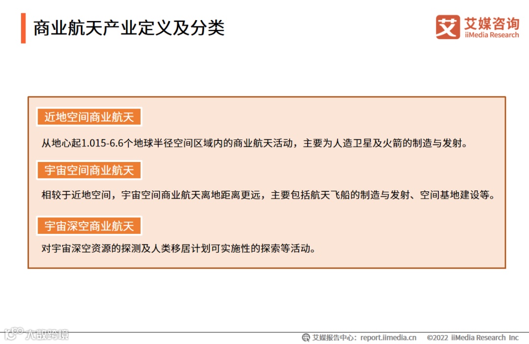 由于现阶段商业航天中的宇宙深空探索尚在进行中,因此本报告主要分析的是:近地空间商业航天产业。