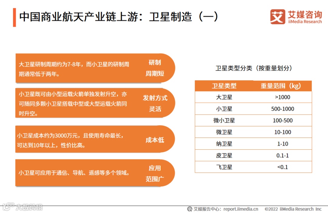 卫星根据重量可划分为大卫星、小卫星、微小卫星、微卫星、纳卫星、皮卫星及飞卫星,商业航天多采用小卫星。广义的小卫星是指重量低于1000kg的人造卫星,具有研制周期短、发射方式灵活、成本低、应用范围广等特点。