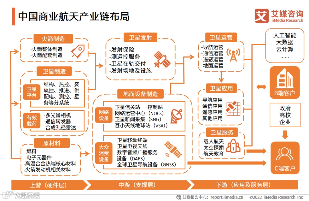 iiMedia Research(艾媒咨询)数据显示,2022年中国商业航天市场规模预计突破1.5万亿元。从市场规模看,中国商业航天产业已经迈入产业发展的快车道;从应用场景看,虽然商业航天仍处于产业发展的初级阶段,但发展空间及潜力极大。