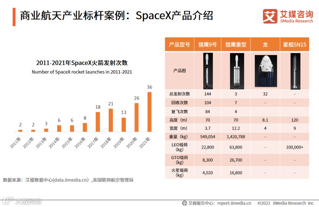 在美国政府、军方及社会资本的支持下,SpaceX研制了猎鹰9号、猎鹰重型火箭,龙系列航天器、星舰SN15飞船等极具竞争力的商业航天产品。数据显示,2011-2021年间SpaceX总共进行了141次发射,其中有100次成功回收火箭、78次助推级复飞。