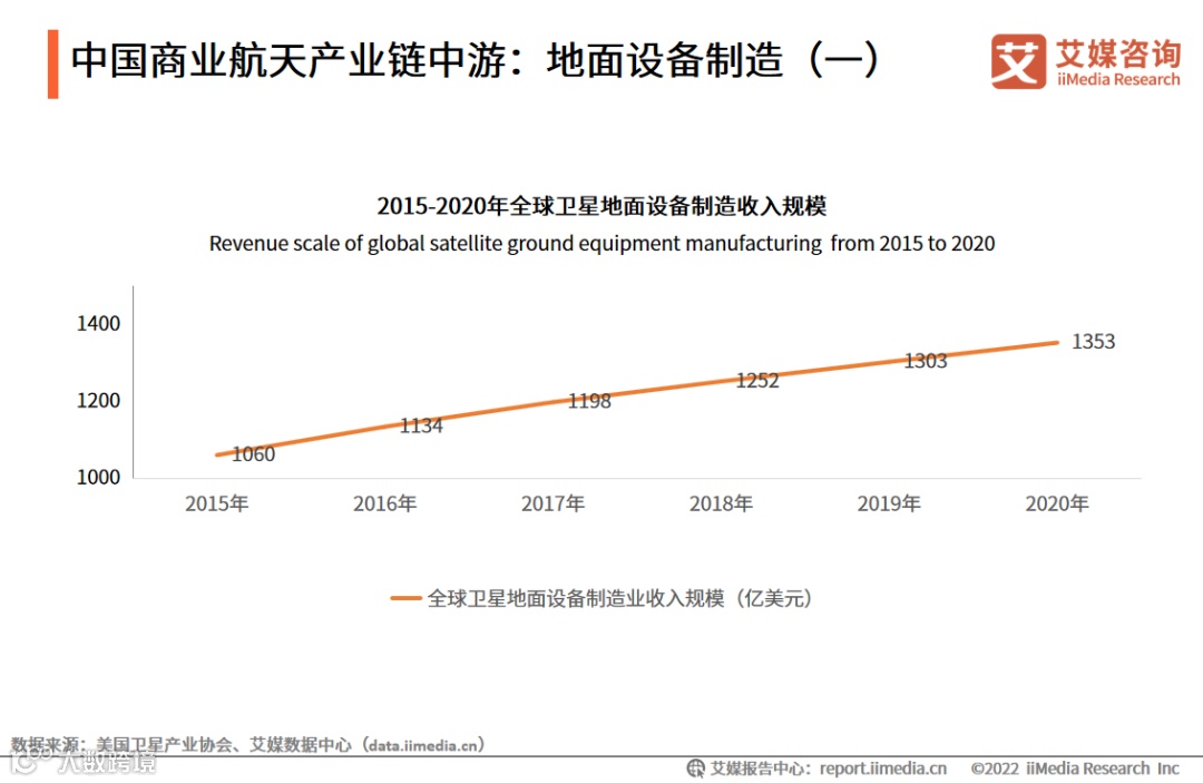 地面设备制造也是商业航天产业链中游的重要环节,主要面向导航、通信、遥感等多个应用终端。从市场规模看,全球卫星地面设备制造的收入保持稳定并缓慢增长。全球市场规模从2015年的1060亿美元增至2020年的1353亿美元。